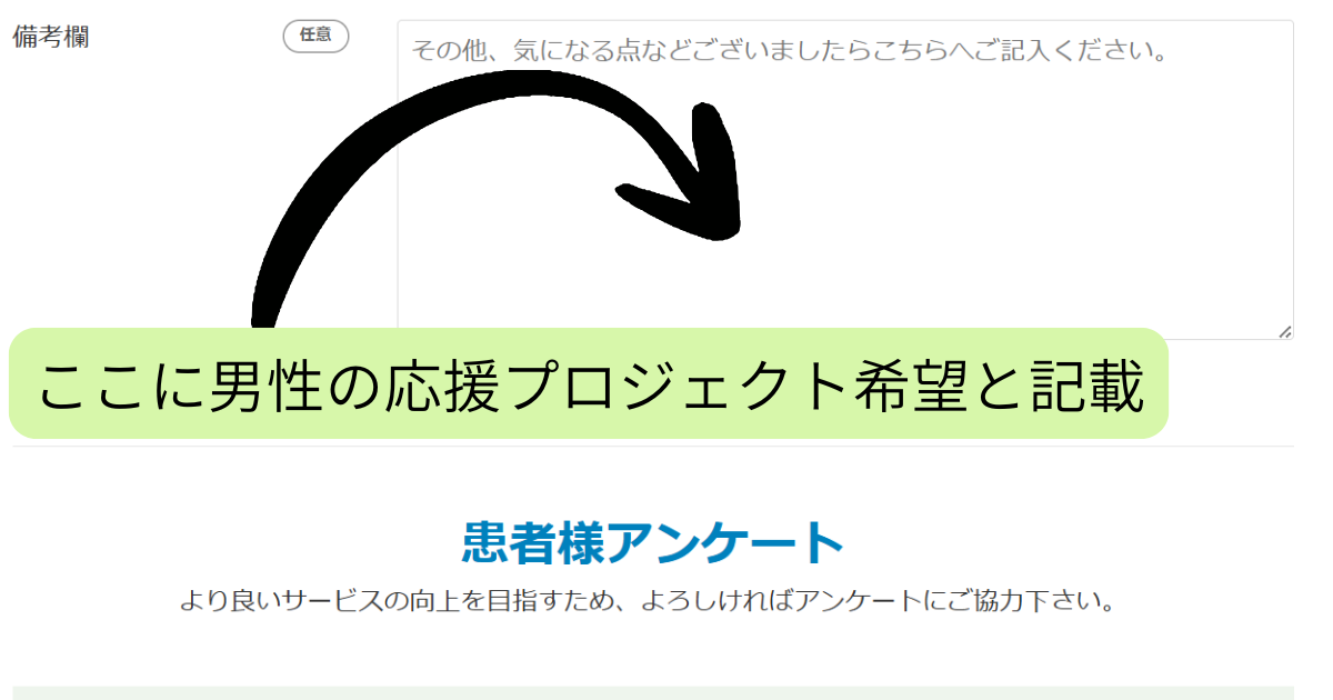 公式サイトの予約フォームの備考欄に「男性の応援プロジェクト希望」と必ず記載してください!!